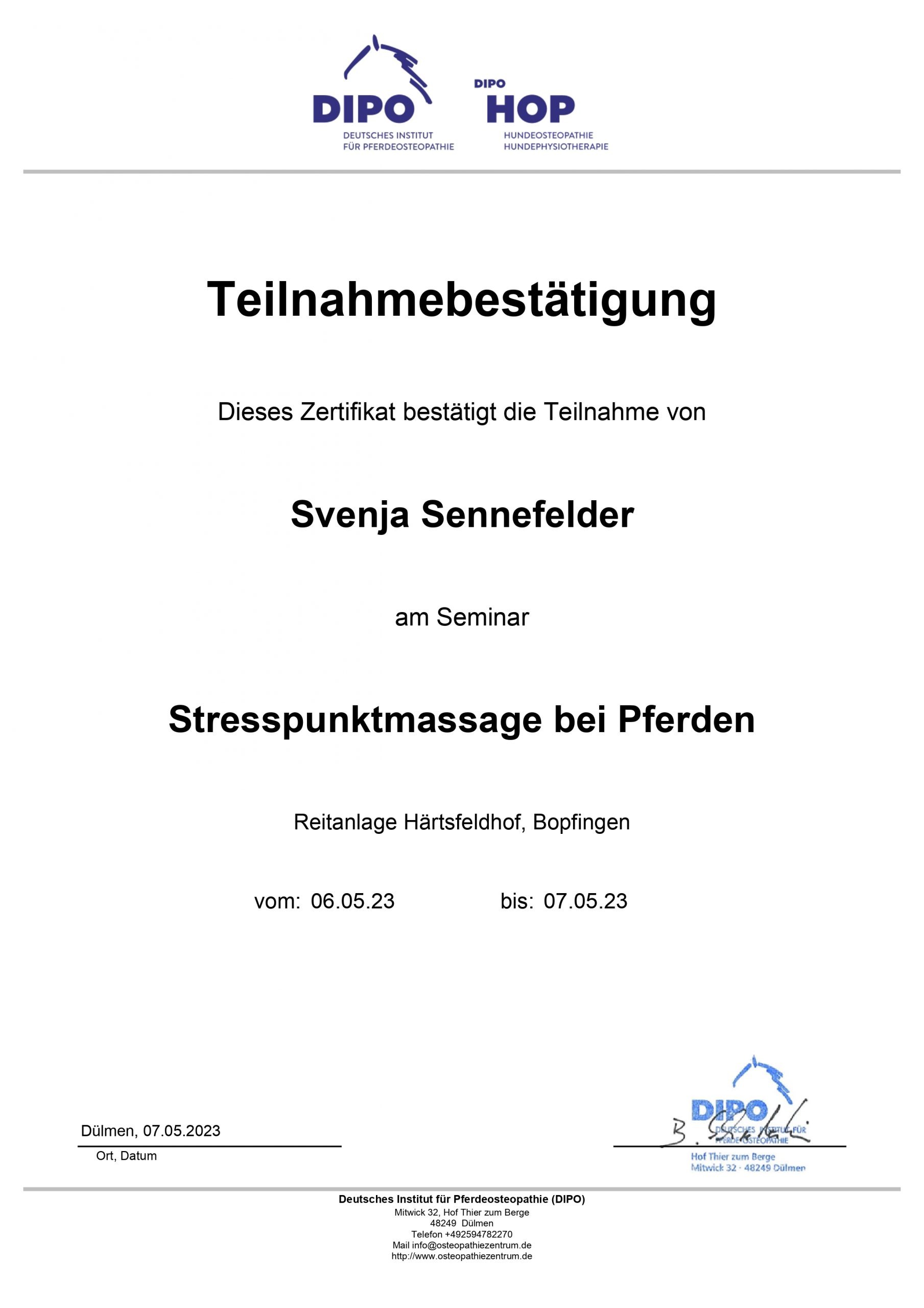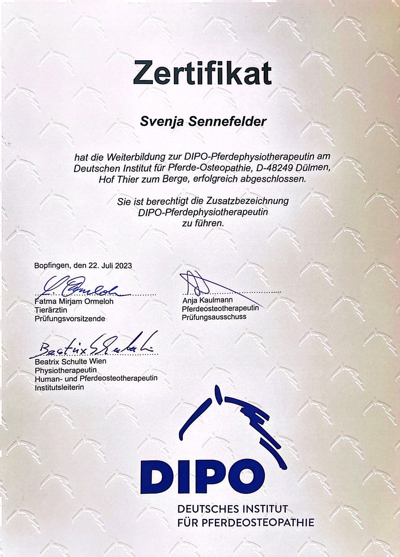 Nach abgeschlossener Berufsausbildung entschied ich mich wieder in die Nähe der Heimat zurückzukehren und meine Weiterbildung zur Pferdephysiotherapeutin bei dem Deutschen Institut für Pferdeostheopathie (DIPO) zu starten. Diese schloss ich im Juli 2023 mit sehr gutem Erfolg ab und darf mich seither DIPO-Pferdephysiotherapeutin nennen.